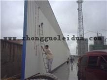 由于该复杂噪音源的存,形成了较为明显的以设备噪音为主的混响噪音,厂区噪音极限值高达90多分贝,厂区本体噪音在75正常生产时在两者之间墙体下方测试噪音值为72分本严重影响了学生的正常学习,为此而引起相关村委教委等高度重视,并下达了定期整改通知否则给予停产整顿、或者是举厂搬迁的处理决定。当时正值学校放暑假要求必须在开学前解决噪音问题,我司临危受命2007年7月中旬动工,历时20天与8月初竣工取得的良好的隔音降噪效果,在隔音屏障校方测试噪音降到了52分贝,在教师测试基本上与本体噪音一致,还学生了一个舒适安逸的学习环境,同时避免了腾泰公司面临拆迁的问题,取得了良好的社会效益与经济效益并举的良好效应。